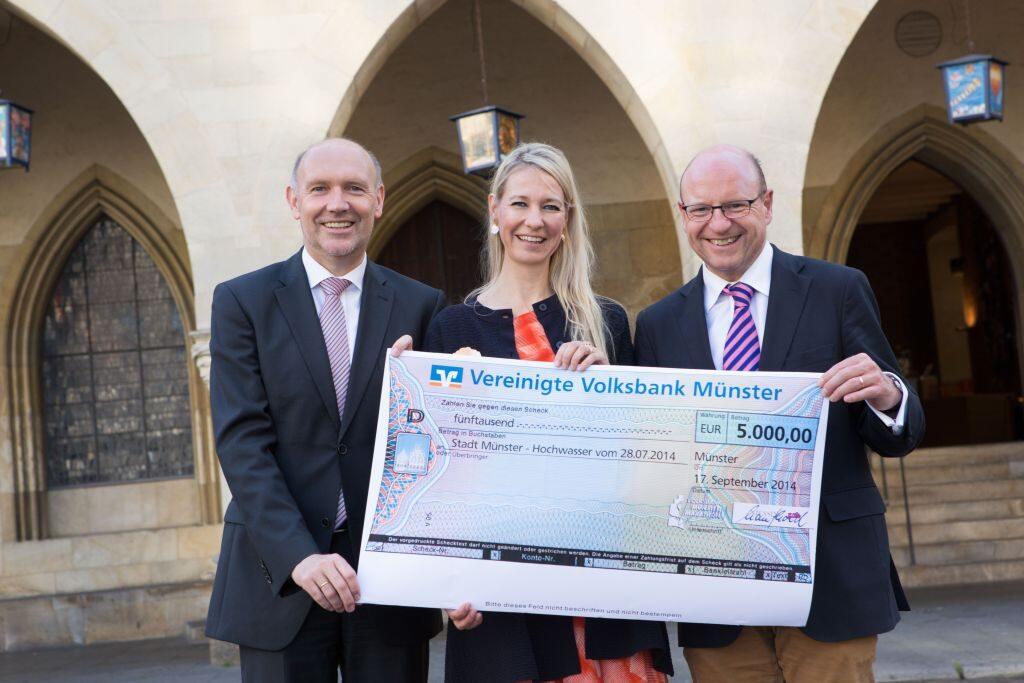 Gute Laune bei der Spendenübergabe vor dem historischen Rathaus: (v.l.) Michael Brinkmann, Sonja Kuhmann-Junge und Oberbürgermeister Markus Lewe. © A.Pawlowitzki