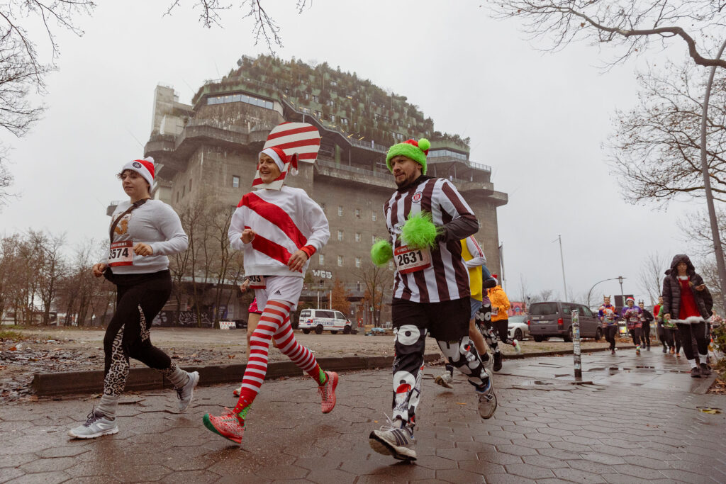Weitaus komplizierter hingegen sind die Kostümierungen. Die „Raupe“ – alias Elbdeich Runners in geheimer Mission aus Niedersachsen – wurde als eines der schönsten Kostüme prämiert und deutete an, 2026 als Schmetterlinge wiederzukommen. Außerdem geehrt: Frau Nussknacker mit ihrem „Ich wollte mich nicht verkleiden, darum bin ich als Nuss gelaufen“-Mann, der Erzengel (alias Leon) sowie der Schornstein mit feststeckendem Weihnachtsmann.