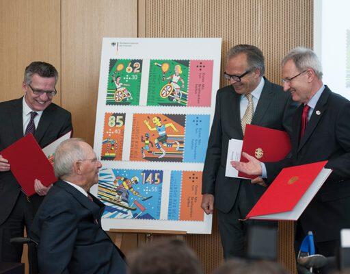 Bundesinnenminister de Maizière nimmt erste Andrucke der neuen Briefmarkenserie entgegen.