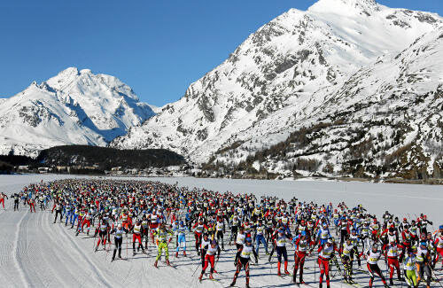 FLASH – Der 45. Engadin Marathon hat nach neun Jahren wieder die Teilnehmer-Marke von 12500 geknackt. Als Skater und Klassiker sind jetzt bei eher warmen Verhältnissen auf dem Weg von Maloja nach S-chanf. Engadin Skimarathon 2013 – 'Blockweise' ueber den Slisersee Caption: M...