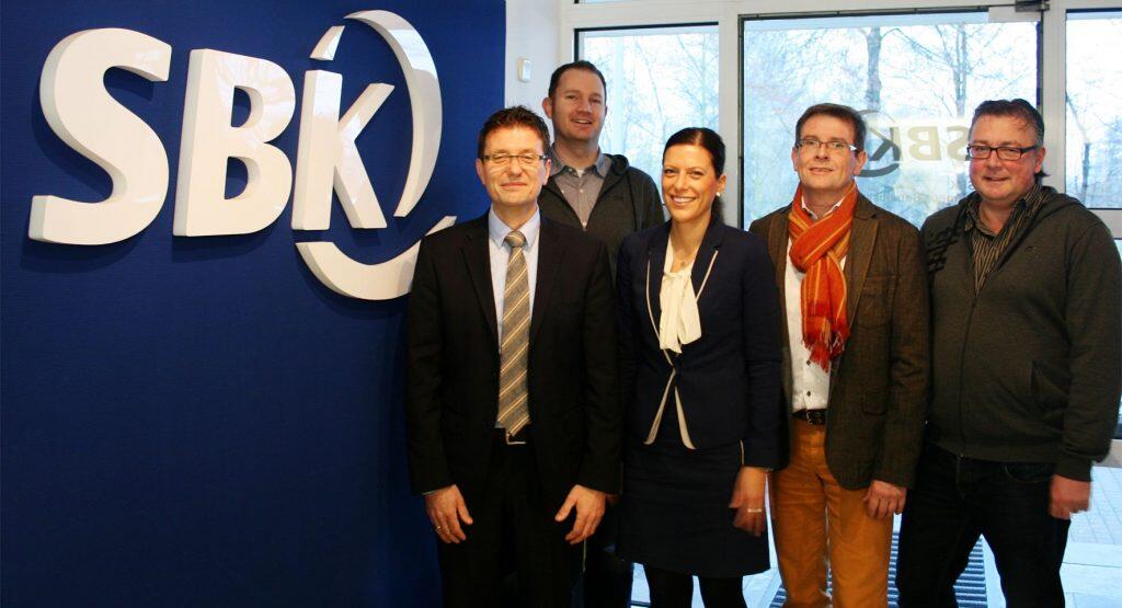 Jetzt mit wissenschaftlicher Begleitung: Friedhelm König (Geschäftsstellenleiter SBK), Christian Stork (Geschäftsführer Paderborner Osterlauf), Claudia Schmidt (Vertrieb Firmenkunden SBK), Hans-Joachim Meier (Projektleiter praenet) und Mathias Vetter (Geschäftsführer Paderborner Osterlauf) freuen sich auf den SBK-Firmencup. ©Paderborner Osterlauf