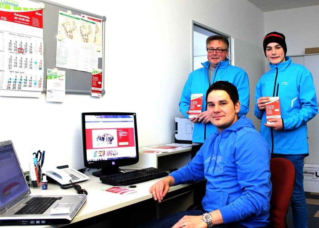 Ab sofort nehmen Dominik Meyer (vorne) und Jan Vetter im eigens eingerichteten Osterlauf-Büro Anmeldungen für den 19. April entgegen. Geschäftsführer Mathias Vetter freut's. ©Paderborner Osterlauf