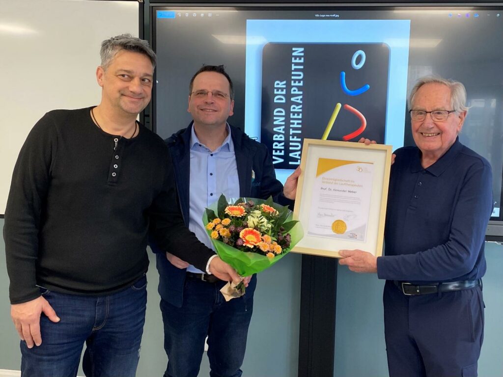 Prof. Dr. Alexander Weber (rechts) wird von Klaus Assenmacher (Mitte) und Dirk Herres (links), Vorstand des Verbands der Lauftherapeuten, die Ehrenmitgliedschaft verliehen - Foto: Wolfgang W. Schüler