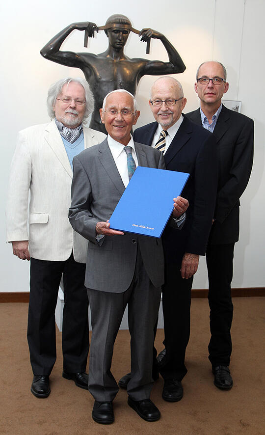 Werner Sonntag erhält den "Horst-Milde-Award" , (Lks.) Gerd Steins vom Forum für Sportgeschichte , (ganz rechts Prof. Dr. Detlef Kuhlmann und Horst Milde (2.v.r.) Foto: 18.10.2014 - Juergen Engler -