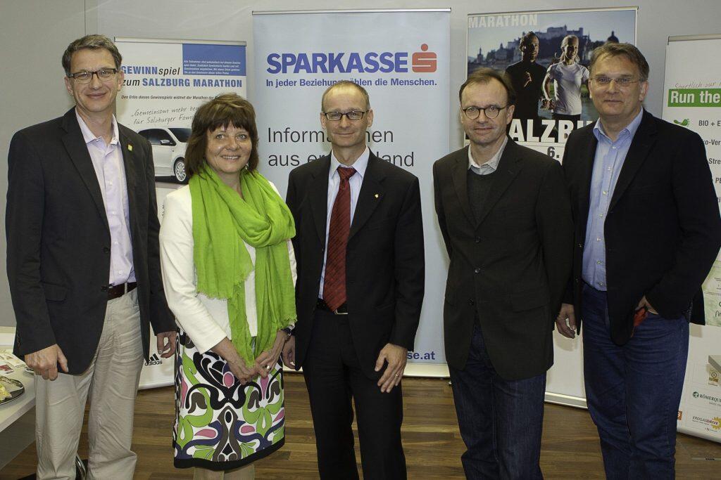DI Andreas Schwaighofer (Geschäftsführer BIO AUSTRIA Salzburg), Mag. Inga Horny (Geschäftsführerin Altstadt Marketing GmbH), Mag. Christoph Paulweber (Vorstandsdirektor Salzburger Sparkasse), MMag. Herbert Brugger (Geschäftsführer Tourismus Salzburg GmbH) und Johannes Langer (Veranstalter Salzburg Marathon). ©Salzburg Marathon/Moßhammer