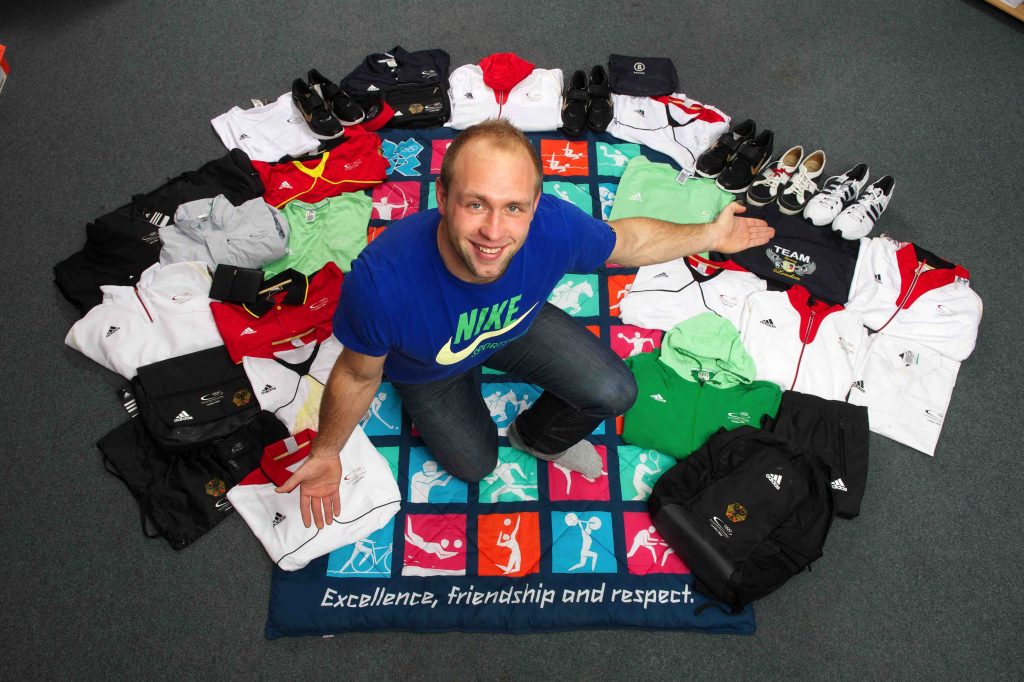 Leichtathletik Berlin 08.01.2013 Robert Harting (Diskus Olympiasieger 2012) mit Teilen seiner Olympiakollektion, die als Charity-Aktion versteigert werden soll Foto: Camera 4