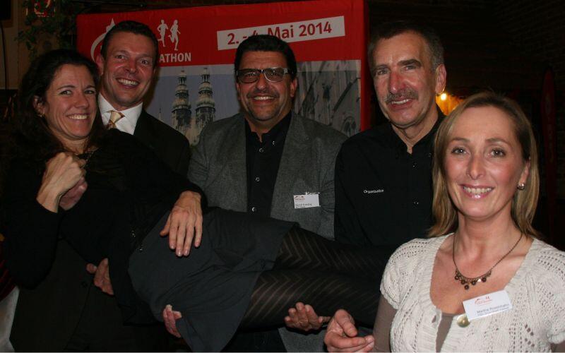 Happy Birthday: E.ON Mitte Vertrieb-Geschäftsführer Ulrich Fischer, Marcel Everding (MLP), Marathon Veranstalter Winfried Aufenanger und „Covergirl“ Martha Rosenhahn (von links) lassen Geburtstagskind und Deutsche Meisterin Silke Optekamp hochleben. ©Michael Bald