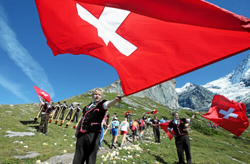 KLEINE SCHEIDEGG,11SEP10 - Folkloristische Abwechslung am Jungfrau-Marathon am Samstag, 11. September 2010. Beim letzten grossen Aufstieg kurz vor der Moraene erfreuen Alphornblaeser und Fahnenschwinger die Marathonlaeufer aus der ganzen Welt. Impression of the Jungfrau Marathon, 'the world's most beautiful marathon course', on Saturday, September 11, 2010. swiss-image.ch/Photo by Andy Mettler
