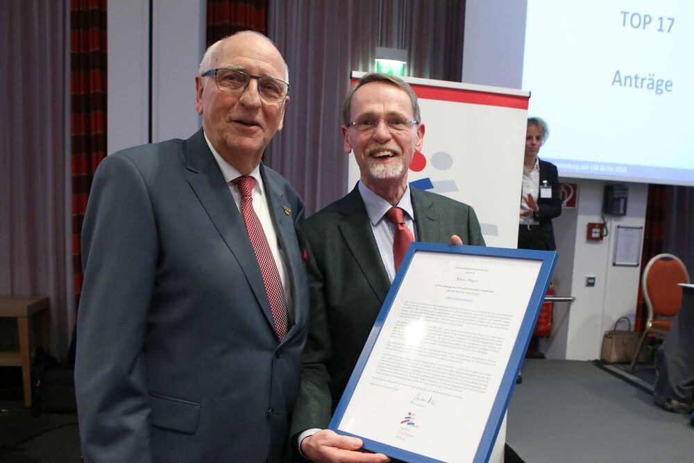 Klaus Böger wurde von Hörmann mit der Ehrennadel des DOSB ausgezeichnet. Die Mitgliederversammlung wählte Böger zum Ehrenpräsidenten.