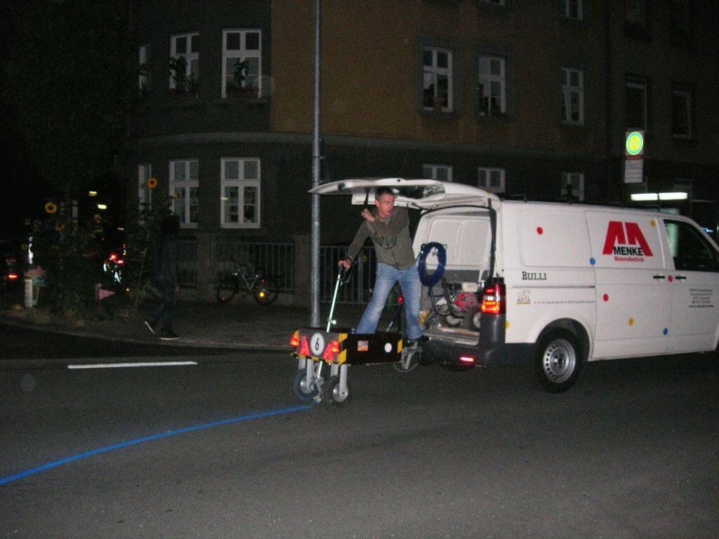 Usus ist auch, das Ziehen der blauen Linie zu begleiten. Marathonfans in Promoshirts auf dem Fahrrad fahren gern von 21.00 Uhr bis 22.00 Uhr mit, bevor das Vehikel sich in die Vororte Nienberge und Roxel begibt und die Mitarbeiter den ein oder anderen Marathonfan noch auf dem Balkon leise Beifall klatschend antreffen.