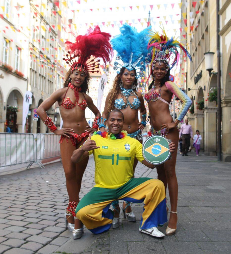 Samba-Trommelgruppe, Cheerleader, lateinamerikanischer Showtanz und Rieseninsekten auf Stelzen – ein Feuerwerk der guten Laune; Klatschen, Tanzen und Staunen nonstop