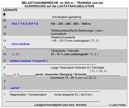 Obwohl die aerobe Energiebereitstellung als Basisleistung die Grundlage für die anaerobe Energiebereitstellung ist, sind in Mittelstrecken – Rennen das Sauerstoffangebot und der Laktatabtransport während der Belastung die wesentlich begrenzenden Faktoren. Für die 800 m muss man aber davon ausgehen, dass die Abbaumöglichkeiten während der Belastung den Anstieg nicht eliminieren können. Insofern sind die Hilfen die aus der aeroben Grundleistungsfähigkeit kommen auch begrenzt.