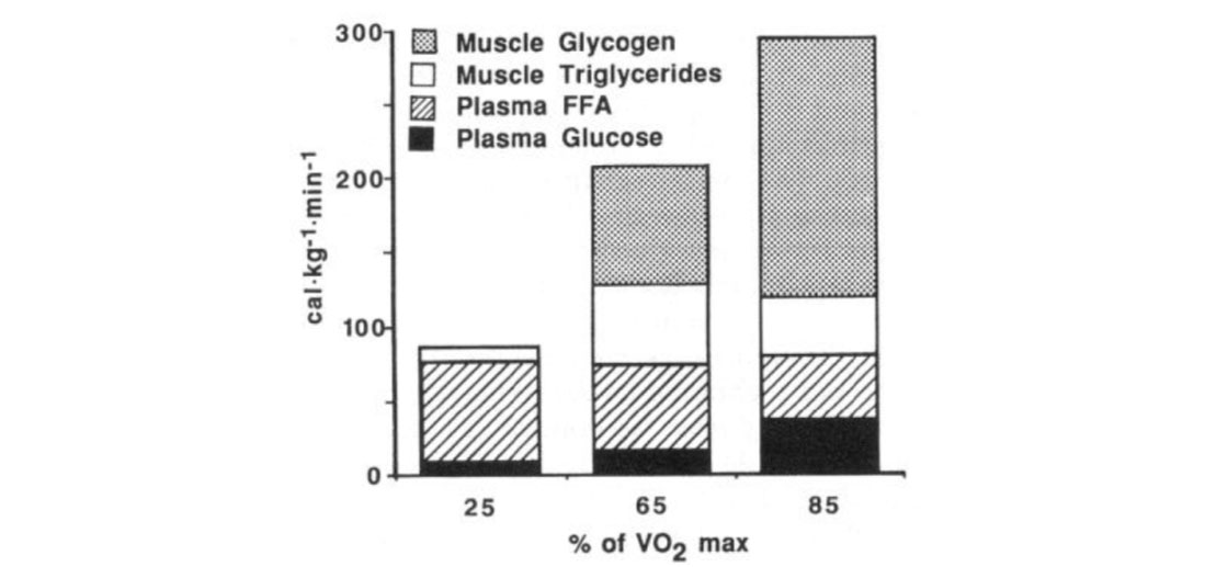 Die Darstellung von Romijn et al. aus dem Jahr 1993 zeigt den Energieverbrauch bei verschiedenen Belastungsstufen (leichte, moderate und hohe Intensität) sowie den Anteil des Kohlenhydrat- und Fettstoffwechsels bei der entsprechenden Intensität. Es ist klar ersichtlich, dass mit zunehmender Intensität mehr Kalorien verbrannt werden und der Anteil der Kohlenhydratverbrennung wächst. Bei geringerer Intensität erhöht sich der Anteil der Fettverbrennung, jedoch sinkt der totale Energieverbrauch pro Minute.