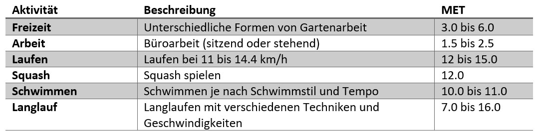 Metabolisches Äquivalent (MET) erlaubt den Vergleich verschiedener Tätigkeiten